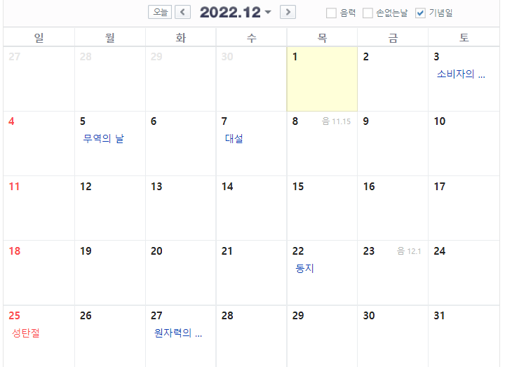 위에서 언급한 바대로 2021년 12월 25일은 토요일이지만 대체공휴일이 없습니다 ㅠㅠ 그렇다면 2022년 크리스마스는 어떠할까요??