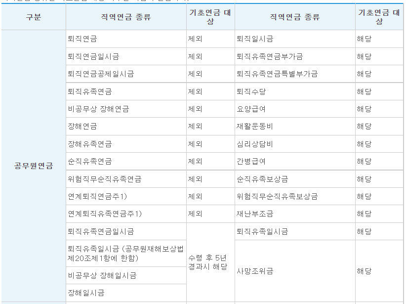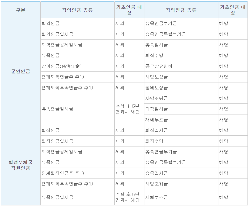 단, 공무원연금, 사립학교교직원연금, 군인연금, 별정우체국연금 수급권자 및 그 배우자는 원칙적으로 기초연금 수급대상에서 제외됩니다. 자신이 수령하는 연금별로 기초 노령연금 수령가능 여부는 아래와 같으니 참고하시기 바랍니다.