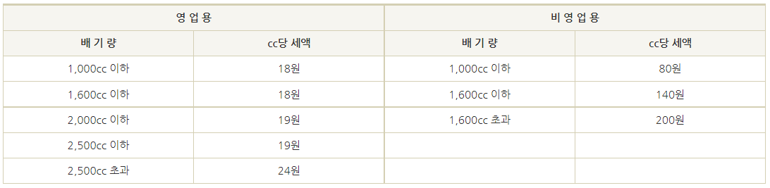 자동차세는 배기량에 따라 다르게 부과되는데, 일반적으로 배기량이 큰 차량일수록 더 많은 세금을 부과하고 있습니다. 그리고 승용차량, 승합차량, 특수차량 등에 따라서도 기준이 다른데, 과세기준은 아래와 같습니다.