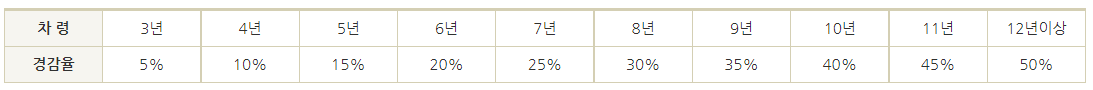 하지만 1년 세액을 일시에 납부가능한데, 이럴 경우 10% 할인혜택이 주어집니다. 일시납부의 경우 매년 1월, 3월, 6월, 9월에 납부가 가능합니다. 그리고 자동차 연수에 따라서 할인혜택이 주어지는데, 할인율은 아래와 같습니다.