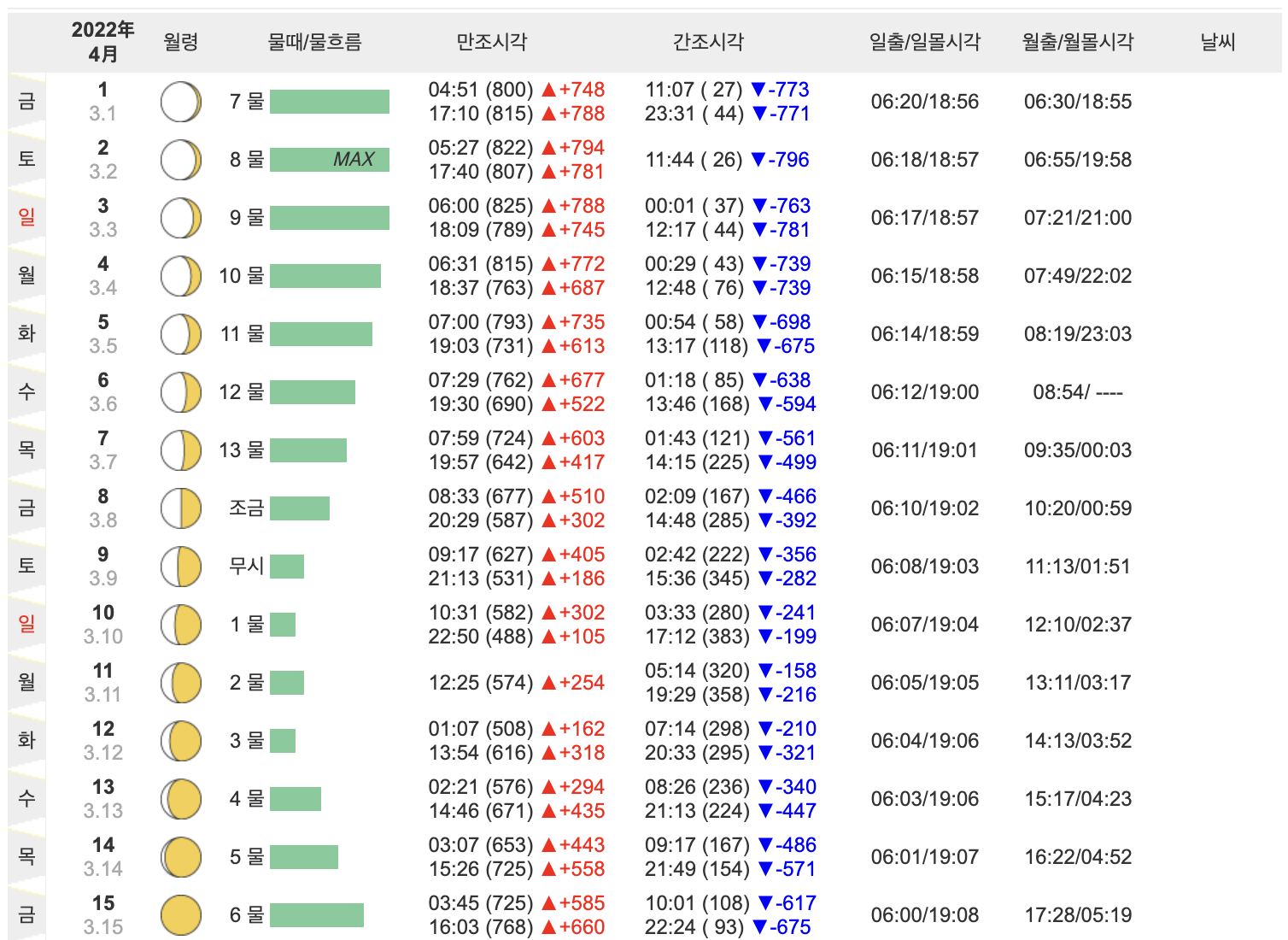 지금부터아래에서 2022년 4월의 제부도 물때시간표를 확인해보겠습니다.